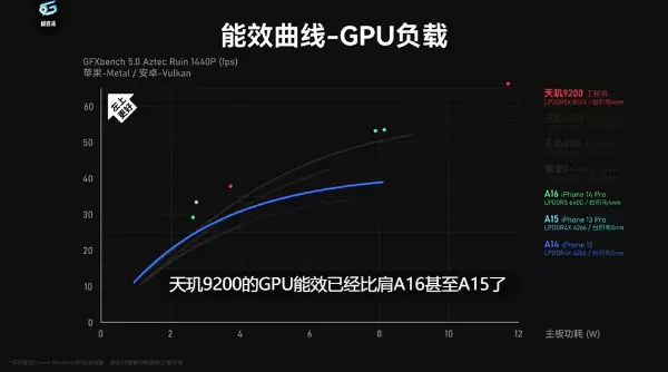 通过GPU能效曲线来看,天玑9200的GPU能效已经比肩苹果A16甚至超越A16了。