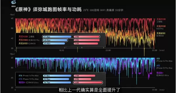 此外,极客湾的测评还覆盖了天玑9200的手游体验。成绩显示,在室温25度720P高画质下的《原神》须弥城跑图测试中,天玑9200整机5.9W情况下帧率跑到57.3帧,能够实现流畅运行,相比上一代旗舰得到了全面提升。