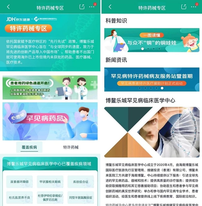 今年5月,为了进一步助力解决更多罕见病患者的药物可及的问题,京东健康与博鳌乐城罕见病临床医学中心开启合作,依托海南博鳌乐城推行的“先行先试”政策,基于京东健康罕见病关爱中心“医+药+服务+支付”的全生态服务体系,双方通过上线“罕见病特许药械专区”,帮助罕见病患者不出国门,即可获取海外已上市但国内未获批的药品、医疗器械、医疗技术;双方还聚焦解决罕见病确诊就医难、药品支付难等问题,优化一站式服务体验。