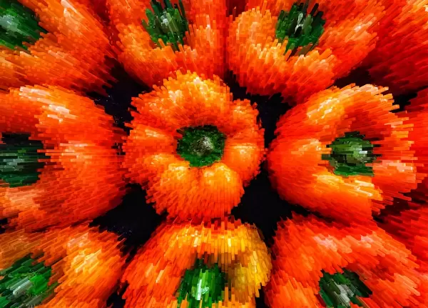 下面这幅名为《彩椒》的作品,作者在深色背景前俯拍了彩椒,无限放大后的彩椒呈竖条颗粒状,橙色和绿色地竖条规则化聚拢排列,有点眩晕之美。