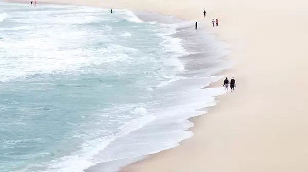 下面这幅名为《在浪漫的海滩上》的作品,是作者用华为 P30 Pro拍摄的海边旅游常见的场景,海湾的C字型构图中,海浪轻轻拍打着海滩上的细沙,像演奏一曲舒缓的乐曲。