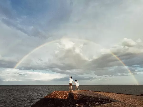 下面这个作品名为《Double Rainbow》,作者巧遇极为少见的双彩虹,且在海平面上完整显现。拍摄者就让父亲和女儿走进画面,拍摄下他们在海边遥看彩虹的快乐背影。大手拉小手,一起手指彩虹的惊喜样子,又为彩虹本身的美丽增添几许鲜活。