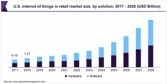 通过自动导引车和机器人、手持扫描仪以及VR/AR分拣系统加快订单履行速度,提高订单准确性。利用RFID和其他传感器进行实时库存管理。将过去的气隙和孤岛系统进行连接,实现配送自动化,进行更加实时的配送管理。通过手持POS机和店内行为监测传感器提升客户体验。采取高性价比的防损措施,例如:在商店和配送中心使用现场监控的安全摄像机和传感器。短时间内,市场对这些设备的依赖不会下降。GrandView Research的一份市场分析报告显示,物联网技术的进步预计将推动零售业收入在2021至2028年期间实现26.0%的复合年增长率,达到1,820.4亿美元。