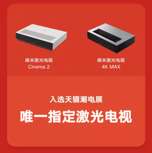 今年双十一,峰米推出了惊喜折扣、分期免息、送视频季卡等一系列优惠活动,以诚心回馈顾客。一直以来,峰米都致力于探索兼具清晰、便捷、高帧率、高沉浸感的影视设备,旗下推出的激光电视:峰米4K激光家庭影院MAX、峰米全色激光电视T1、峰米激光电视Cinema 2等产品,为用户带来不同价位的大屏娱乐选择,畅快观影,白天也能欣赏高清大片,因此峰米4K MAX与峰米C2同时入选天猫潮电展唯一指定激光电视。