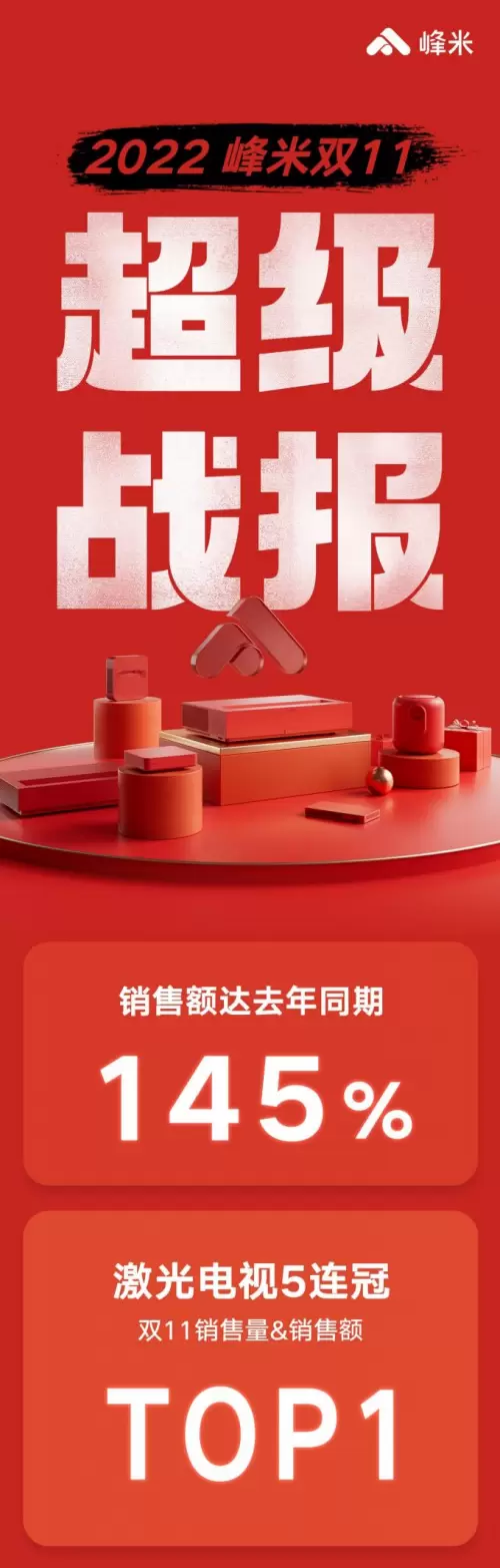 2022年双十一促销活动落下帷幕,“激光智能投影的开创者”峰米投影(以下简称“峰米”)刷新纪录,再创多项佳绩。销售额达去年同期145%,强势再夺激光电视线上销售额和销量双料冠军,自2018年起达成五连冠!获得如此耀眼战绩,再一次证明了峰米品牌在激光投影行业的领军地位和来自消费者的品质认可。