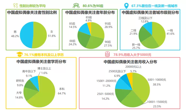 尽管目前虚拟偶像的大众认知度并不高,仍属于二次元小众文化圈层的狂欢,但根据调查数据,80%的虚拟偶像关注者为90后,高学历年轻人群占主体。随着越来越多的年轻人走向社会,承担起经济建设的重任,他们在虚拟偶像领域的消费能力和消费水平将不容小觑。