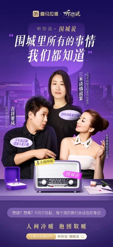 《听你说·百态人声》以“人间冷暖,抱团取暖”为slogan,联合平台主播、知名情感主持人叶文、戴军、青音以及平台原创创作者组成“喜马抱抱团”,以征集的真实故事为案例,在线为深受情绪问题困扰的听友提供聆听、解答和陪伴,助力听友个人成长和自我实现。《听你说》属于喜马拉雅自制原创节目,洞悉用户在时代背景下的情感需求,依托平台丰富的情感内容和原创IP的积累沉淀,在话题的选择上无不切合用户的注意力焦点,并从基于情感内容的话题对谈、听友互动中丰富和活跃着互动内容社区生态。