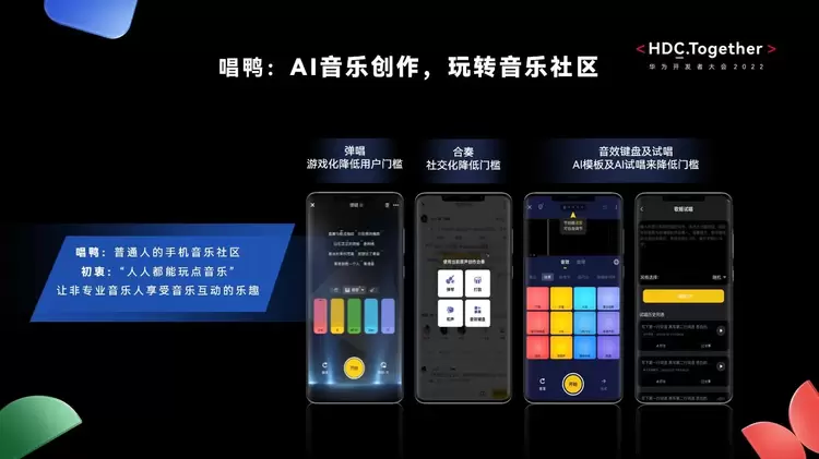 在华为开发者大会2022(Together)智慧AI技术论坛中,唱鸭作为一款作为深受用户喜爱的音乐社区软件,讲述为满足用户不断增强的创意设计,如何与HMS Core音频编辑服务合作,打造更具创意的音乐“玩法”。11月5日唱鸭正式推出,由HMS Core音频编辑服务歌声合成技术打造的“AI创作歌姬”功能。基于华为独创的AI Singer模型,歌声合成可以精准预测颤音、扰动和换气声等演唱技巧,让拟真的呼吸音与歌曲节奏完美契合,实现歌手级的高水准演唱,给用户带来了令人惊喜的新奇体验,释放更具创意的音乐创作力。