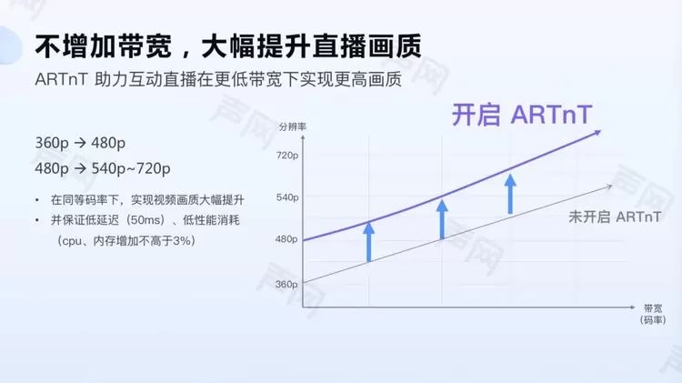 越来越多的直播场景和应用在尝试采用更低延时的互动直播能力,从而创造更强的黏性、体验和销售结果。据统计,声网低延时场景用量增长了4倍,经过技术的改进和提升,低延时直播的卡顿率低于HLS、易用性对齐CDN、画质突破现有条件限制,为直播平台提供了更高质量、全面超越过去的全新玩法和体验空间。结合声网最新一代的视频技术ARTnT,在同样的带宽下面,可以系统性持续实现更高画质.比如在360p分辨率下可以实现480p的画质,480p可以感受到540p甚至是720p的画质,画质提升也间接带来业务增长。