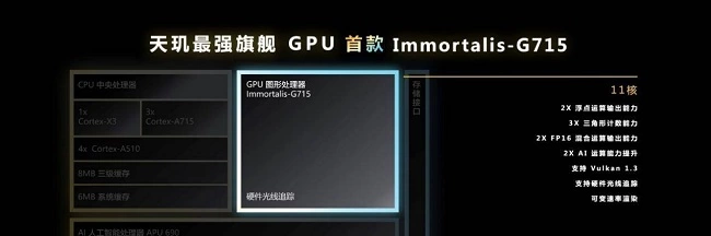 GPU的性能决定了移动芯片图形渲染能力的上限,是提升移动端游戏体验的关键。联发科天玑9200移动芯片率先搭载全新一代Arm Immortalis-G715旗舰11核GPU,带来高达32%的性能提升,功耗大幅降低41%,为移动游戏持续高画质、高帧率提供核心动力。