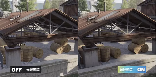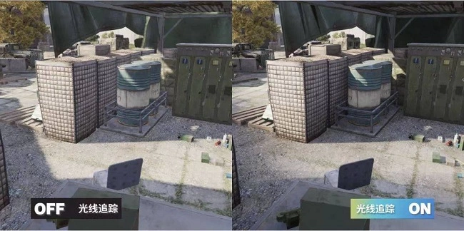 在《暗区突围》游戏中的实际应用上,在游戏环境的阴影效果方面, 室外的光线追踪阴影能够模拟真实的太阳光阴影形态,近处的阴影锐利,远处的阴影柔和。基于光线追踪的环境光遮蔽,能够体现出相交物体间的漫反射光线遮挡效果,进而强调出物体间的摆放关系,让画面更有层次感。相较于传统的环境光遮蔽技术,基于光线追踪的环境光遮蔽,由于可以获取到准确的场景信息,其能够更加精准地体现物体间的环境光遮蔽关系,避免传统技术中的黑晕等现象出现。更好的优化了玩家在游戏地图中的真实体验感。以高度还原自然光的品质为玩家提供更身临其境的战局感。