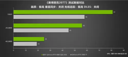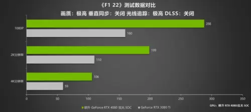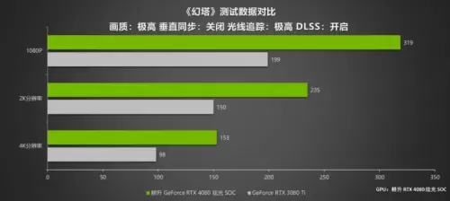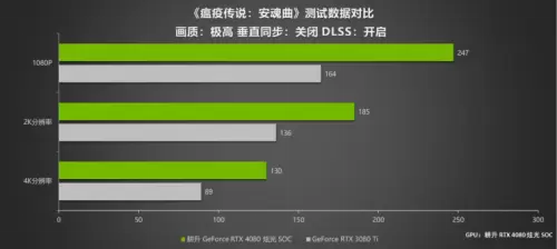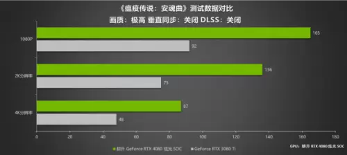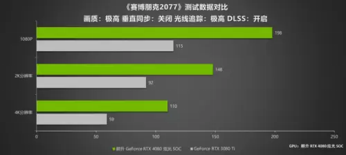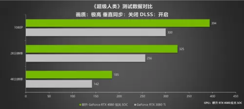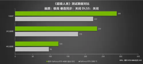 在《超级人类》中,RTX 4080 表现出了其强大的性能优势。在与RTX 3080 Ti的对比中可以看到,RTX 4080 与RTX 3080 Ti有明显的性能差距。在极高画质DLSS关闭的情况下,4K分辨率RTX 4080 能跑到123帧,2K分辨率能跑到233帧,1080P下能跑到289帧。当DLSS 3 帧生成技术开启的时候,帧数就有一个明显的涨幅。RTX 3080 Ti平均涨幅为46-78帧,而RTX 4080 则是最高能涨105帧,可见对比DLSS 2,DLSS 3 对游戏的性能提升是十分强大的。
