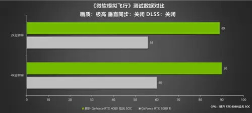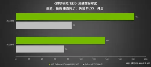 首先要来进行测试的是《微软模拟飞行》,《微软模拟飞行》是NVIDIA 官方公布首批支持DLSS 3 的游戏之一,DLSS 3 的帧生成模式能大幅提升游戏性能优化游戏体验。在实机测试中,极高画质4K分辨率下,RTX 4080能跑到90帧左右,2K分辨率下也能跑到89帧上下。而开启DLSS 3 帧生成模式后,帧数有了明显的区别。在4K分辨率下,RTX 4080可以跑到137帧的成绩,2K分辨率更是能跑到182帧的优秀成绩。在DLSS 3 的提升下,玩家可以在游戏中流畅地欣赏世界各地的优美风景。