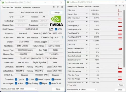 由检测软件GPU-Z可看到升 GeForce RTX 4080 炫光 SOC的产品规格和基本参数,以及其待机温度为31°C,功耗为7.6W。