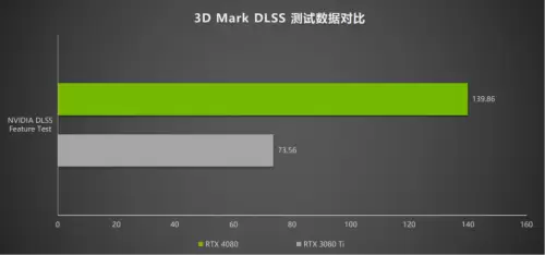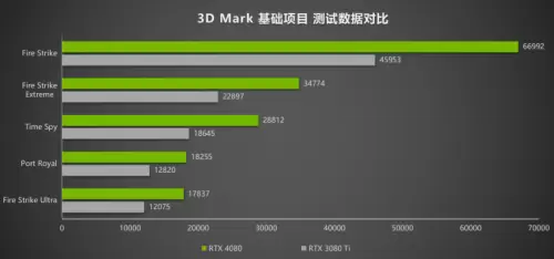 首先使用3DMark软件来进行GPU各项基准测试。从测试结果上来看,耕升 GeForce RTX 4080 炫光 SOC GPU较于RTX 3080 Ti有明显的性能提升:Fire Strike 提升了46%,Fire Strike Extreme 提升了52%,Time Spy 提升了55%,Port Royal 光追测试中提升了42%,Fire Strike Ultra 提升了48%。在与RTX 3080 Ti的DLSS 2 对比中,RTX 4080 的DLSS 3 明显有巨大的优势,帧数提升将近2倍。可见搭载了全新Ada Lovelace核心架构和光流加速器的 耕升 GeForce RTX 4080 炫光 SOC比上一代同级别旗舰级显卡在各方面性能都有大幅度提升。