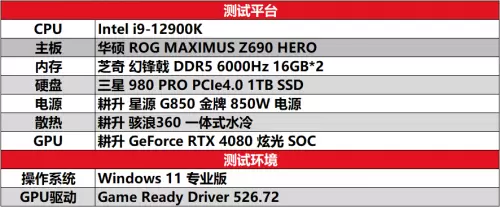 正式进入测试环节,为了不让CPU和主板限制GPU本身的性能,故本次测试平台处理器采用英特尔酷睿i9-12900K搭配 华硕 ROG MAXIMUS Z690 HERO主板;内存采用 芝奇 幻锋戟 DDR5 6000Hz 16GB*2;电源采用的是 耕升 星源 G850金牌 850W搭配 耕升 骇浪360 一体式水冷,能最大程度为GPU降温和供电。驱动更新至最新的 NVIDIA Game Ready驱动526.72版本。这套配置足以让耕升 GeForce RTX 4080 炫光 SOC 显卡能在稳定的环境下最大程度发挥出超强性能。