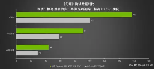 《幻塔》是一款支持NVIDIA 光线追踪和DLSS 3 的游戏,光线追踪的加持让游戏呈现出拟真的光线物理效果,带来逼真的画面。在游戏测试中可以看到,RTX 4080 在极高画质光线追踪开启DLSS关闭时,4K分辨率下仅有44帧,RTX 3080 Ti 仅有29帧。而在2K分辨率下,RTX 4080就有91帧,1080P下更是有157帧。而开启DLSS 3 后,帧数就实现了质的飞跃,在4K分辨率下有153帧,在2K分辨率下有235帧,在1080P下更是有319帧,帧数提升近两倍。