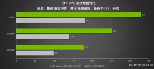 《F1 22》作为首批支持DLSS 3 里面唯一的赛车游戏,被诸多赛车游戏玩家寄予厚望。游戏本身的性能表现就已经十分不错,在经过DLSS 3 的优化过后,游戏性能则是更上一层楼。在极高画质光线追踪开启4K分辨率下,游戏依然能保持106这样一个不错的帧数,2K分辨率下能跑到199帧,1080P下更是能跑到288帧。虽然这样的帧数已经足够支持玩家游戏,但是在DLSS 3 的优化下,游戏帧数能跑到一个更高的程度。开启DLSS 3 帧生成模式后,4K分辨率下能跑到179帧,2K分辨率下能跑到253帧,1080P下更是能跑到329帧,性能提升接近2倍。