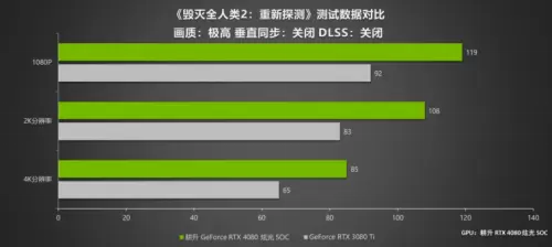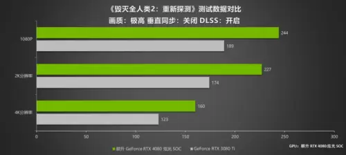 在《毁灭全人类2:重新探测》中,RTX 4080 的表现依旧优异。在这款游戏中,DLSS 3 的提升十分显赫,在极高画质 DLSS 关闭 4K分辨率下,游戏只有85帧的成绩,2K分辨率下能跑到108帧,1080P能跑到119帧。而在极高画质DLSS 3 开启的情况下,4K分辨率下则是能跑到160帧,2K分辨率下则是能跑到227帧,1080P下也能跑到244帧。与关闭DLSS技术相比,性能有接近2倍的提升。