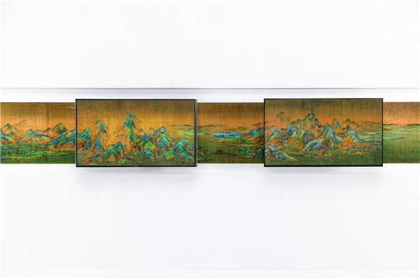 《千里江山图》还原青绿本色挑战中,极果网打造了还原千里江山图长卷的背景装置,用于电视色彩进行对比测试。悬挂的海信ULEDX电视落下后,与背后装置颜色一致,“千里江山”衔接自然,每一种颜色都很真实、纯净,由于色彩还原准确,使得画面整体结构和立体感增强;而OLED电视虽然对画作的还原度也很高,但是色彩略显灰暗,通透感较差。