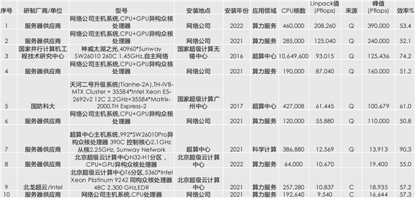 中国科学院计算技术研究所研究员张云泉在发表“2022年中国高性能计算机T0P100排行榜发布及趋势分析”报告时介绍,在2022中国HPC TOP100中,由某服务器供应商研制、部署于某网络公司的主机系统以208.26 PFLOPS(约20.83亿亿次每秒)的测试性能新登榜首,相比2021年榜首机器有1.66倍的性能提升。该主机系统采用CPU+GPU异构众核架构,CPU核数达到46万核,系统峰值达到390 PFLOPS。