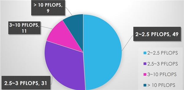 从性能份额看,未公布具体研制单位信息的机器性能占比57%,国家并行计算机工程技术研究中心、国防科大分别以2台、4台机器上榜占得10%、8%的性能份额,分列第二、三位。