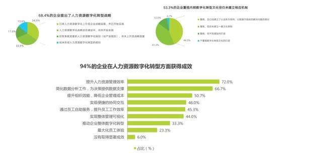 《CHO人才战略调研报告》数据显示:68.4%的中大型企业已将人力资源数字化转型上升至企业战略层面,人员规模越大的企业整体人力资源数字化成熟度越高;97.3%的调研企业对数字化文化的打造持重视态度,仅有2.7%的专家表示公司不重视打造内部数字化转型文化;94%的企业在人力资源数字化转型中获得成效,包括提升人力资源管理效率、降低企业管理成本等。