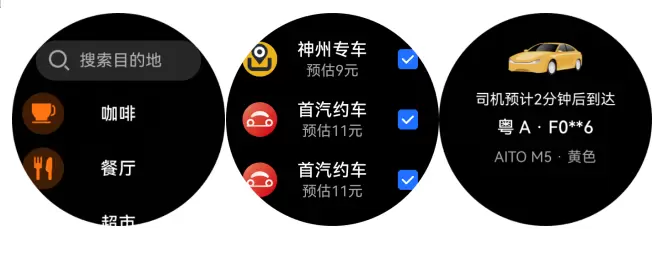 用户通过手表打车,设置起始地与终点时,可直接选择手表推荐的上车点,也可通过搜索的方式来确认上车点和目的地。地点设置完成后可在手表进行车型选择、呼叫司机、查看行程状态等操作。