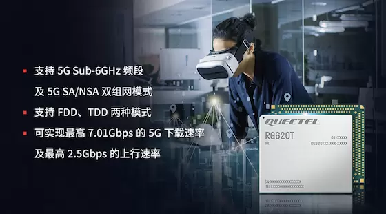 搭载MediaTek T830的移远通信5G 模组RG620T符合3GPP R16标准,且支持5G Sub-6GHz频段及5G SA/NSA双组网模式,从而帮助用户突破网络使用过程中面临的区域覆盖、卡顿的界限,带来更稳定、更流畅的5G网络体验。