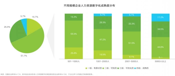 《报告》基于ATOP模型对174家企业人力资源高管进行了深度调研,全面分析了企业人力资源数字化成熟度情况。调研结果显示,目前有51.7%的企业人力资源数字化成熟度水平位于第二等级,整体来看,企业人力资源数字化成熟度与企业规模成正比。