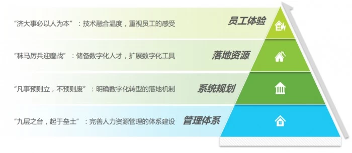 据报告调研结果显示,目前企业人力资源数字化转型痛点在于战略传导难、机制构建难、人才储备难、工具扩展难、体验升级难。针对这些痛点,报告指出,底层管理体系、顶层系统规划、落地资源与员工体验是人力资源数字化转型成功的核心要素。