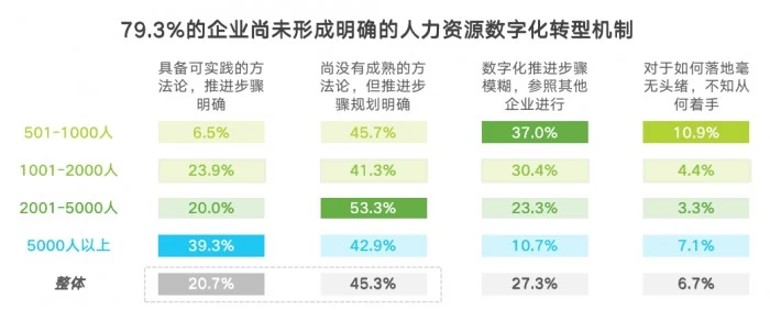 具体到转型推进步骤上,企业有明确的数字化转型战略是一方面,另一方面,还要将战略落到具体的执行上,明确人力资源数字化转型推进步骤。从调研数据来看,79.3%的企业尚未形成人力资源数字化转型机制,人力资源数字化工具的完善程度和模块间的集成也有待提高。
