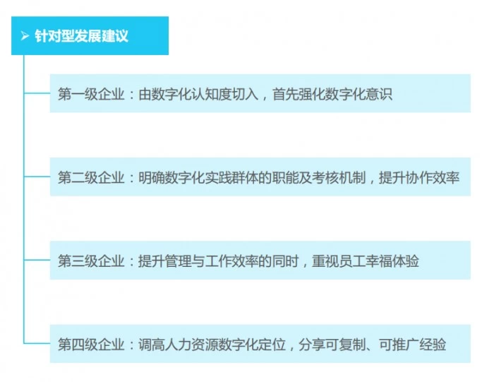 针对人力资源数字化转型痛点,该报告分别为处于有意识级、可知级、可优化级、成熟四个等级的企业提出了发展建议。针对意识层级的企业,建议提高管理者、员工的数字化认知度,营造“数字人力”氛围;针对可知层级的企业,明确数字化实践群体的职能及考核机制;针对可优化层级的企业,建议企业提升管理与工作效率的同时,重视员工体验;针对成熟层级的企业,建议沉淀出转型方法论,赋能外部企业,分享可复制、可借鉴的经验。