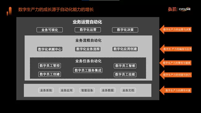 业务运营自动化阶段:弘玑Cyclone提供业务可视化,业务数字化运营和业务数字化决策的产品或解决方案。这个阶段的核心价值是实现数字化业务生产力平台。