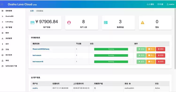 (Oushu Lava Cloud管理页面)