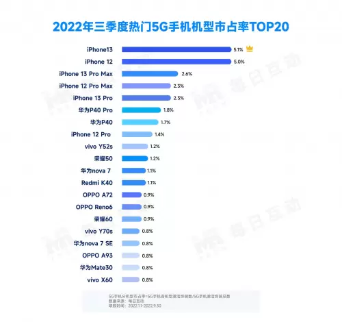 数据智能上市企业每日互动(股票代码300766)持续洞察5G手机市场新变化,并发布《2022年三季度5G手机报告》。报告显示,国内5G手机市场依旧稳步扩大,市占率达37.9%。其中,iPhone 5G手机整体表现突出,荣耀5G手机成为三季度安卓5G手机热卖榜大赢家,华为经典机型仍然具备强劲活力。