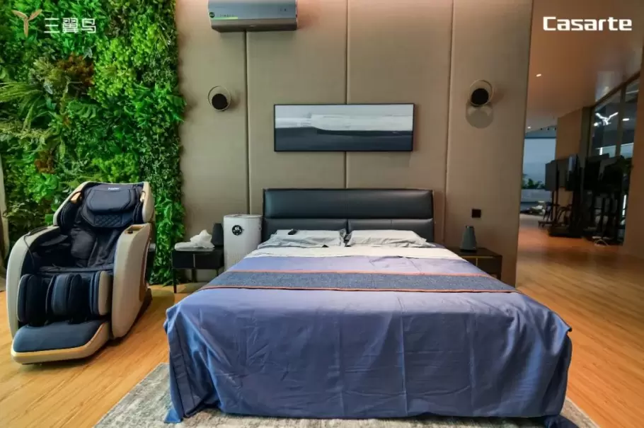 在三翼鸟智慧卧室场景中,空调会静音运行,并通过新风功能保证卧室空气新鲜度。当用户睡着后,智能枕会监测用户的睡眠状态,联动空调自动调节温湿度,再也不用担心被热醒或者冻醒了。智能床垫也会根据用户的身体曲线自动调节睡姿支撑,守护整晚深度睡眠。