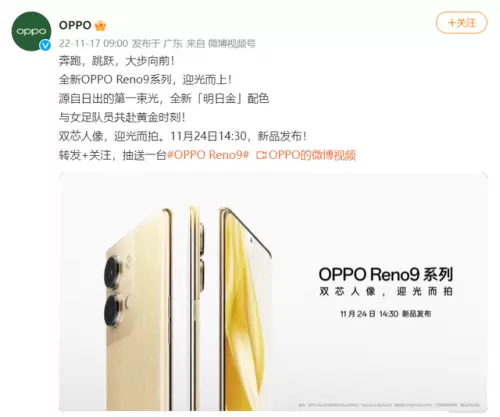 在11月17日上午9点,OPPO官微正式放出了OPPO Reno9系列的预热视频,官宣新品将于11月24日14:30发布!其中文案提到:全新#OPPO Reno9#系列,迎光而上!源自日出的第一束光,全新「明日金」配色,双芯人像,迎光而拍。更让人惊喜的是,无论是文案中的“与女足队员共赴黄金时刻”还是视频内容,都能发现这次中国女足的身影。