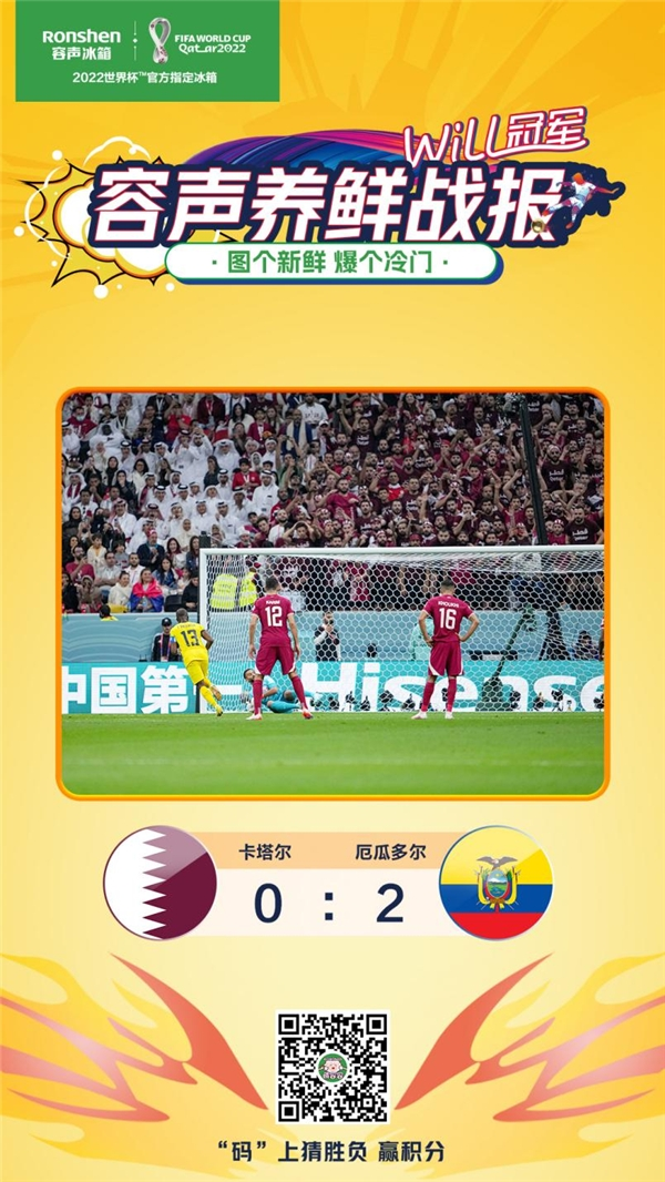 世界杯首战,就打破魔咒,这场景够新鲜,也够冷门。作为此次世界杯的官方赞助商,容声冰箱在开赛前就发布了“图个新鲜 爆个冷门”2022卡塔尔世界杯玩法攻略,以“爆冷赛事竞猜、冷门心愿圆梦、挑战吉尼斯世界纪录”等九重福利,旨在带来一场足球体育赛事与家电消费升级的双重盛宴。