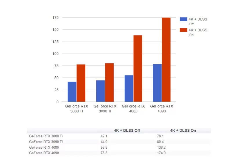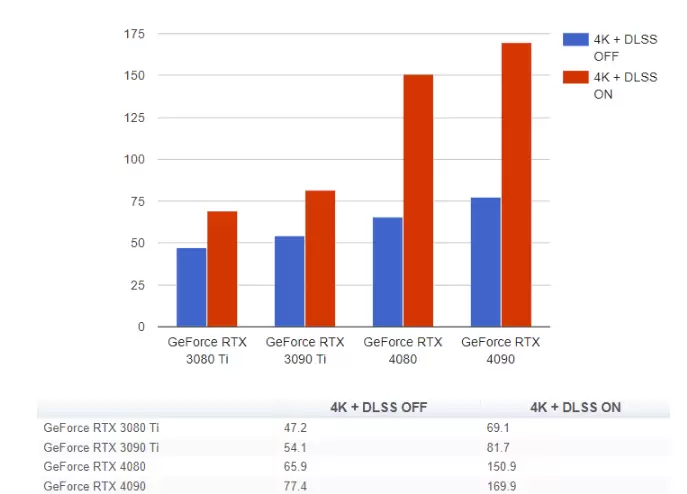 在《瘟疫传说:安魂曲》、《赛博朋克2077》以及《微软模拟飞行》三款游戏实际测试中,4K分辨率、最高画质、光追品质全开、DLSS设置为性能。不难发现GeForce RTX 4080在全新的DLSS 3技术加持下,实现了大幅度的FPS提升,相比上一代的RTX 3080 Ti将FPS提升了两倍,与上一代卡皇GeForce RTX 3090相比提升了70%以上。