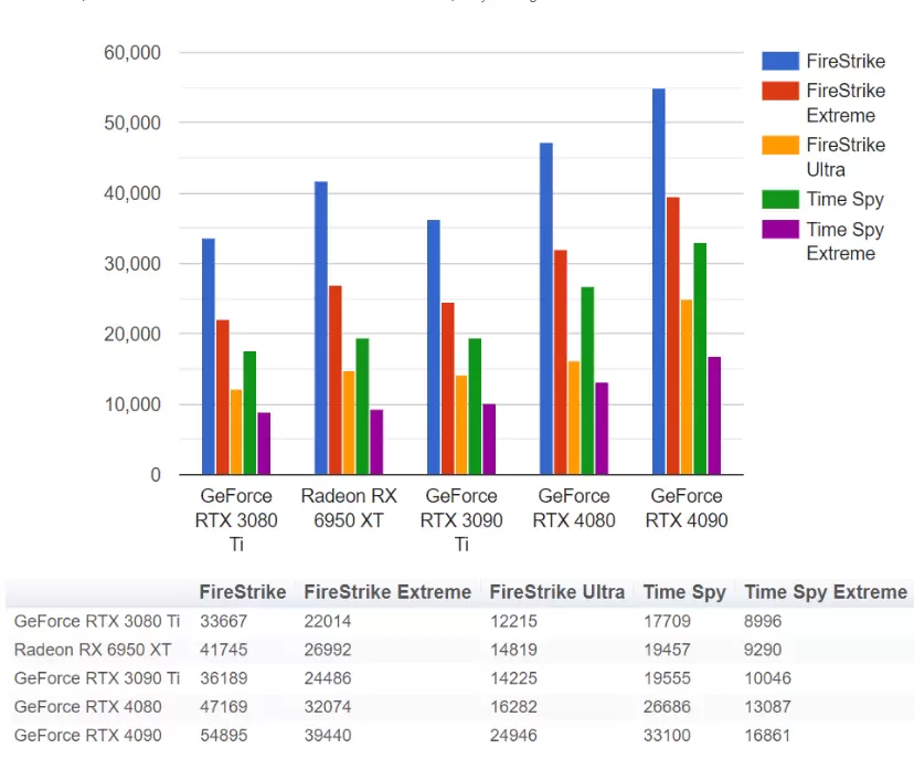 3DMark作为最广泛的3D性能基准测试,性能测试结果能比较直观看出区别。根据测试显示GeForce RTX 4080游戏性能相较上代产品有明显升幅,性能甚至比上代旗舰RTX 3090 Ti更高,但不难发现当分辨率越来越高,RTX 4080与RTX 3090 Ti的差距就会拉近一点。