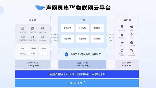 今年6月,为解决物联网平台开发门槛高、音视频体验差等难点,声网推出了“灵隼物联网云平台”,是专注于智能音视频设备的低代码、端到端开发平台,能支持自定义、Turnkey 两种低代码开发模式,提供呼叫服务、云存服务、设备管理、消息管理等核心场景功能,让开发者能一小时构建示例场景。灵活、易用的平台特性也是受开发者欢迎和此次获奖的原因。