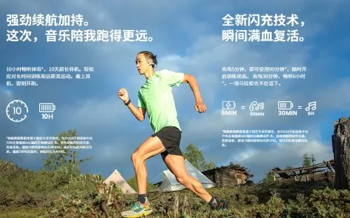 而在续航方面,OpenRun Pro直接配备一颗140mAh大电池,满电状态下能够提供10小时畅听体验,待机时长最高可达10天!最重要的是,OpenRun Pro还拥有非常快速充电性能,充电30分钟即可畅快使用6小时!