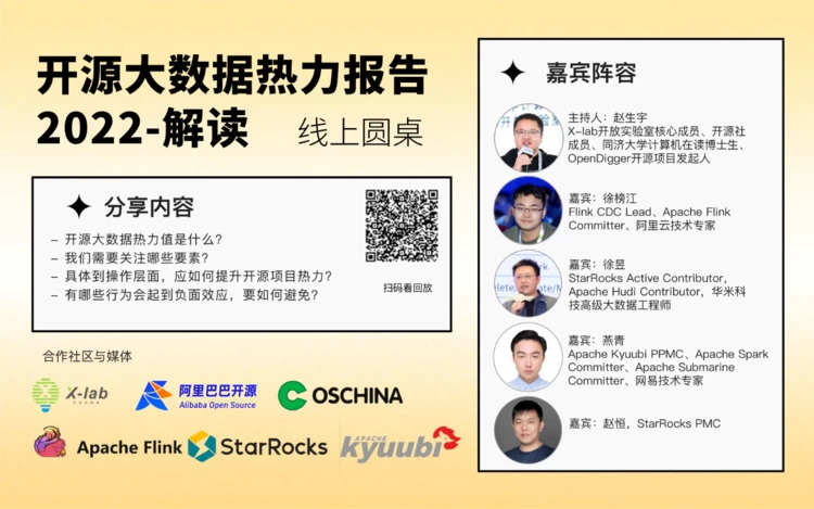 近日,由开放原子开源基金会、X-lab 开放实验室和阿里巴巴开源委员会联合出品的《2022 开源大数据热力报告》(以下简称“报告”)在云栖大会公布。新一代极速全场景 MPP 数据库 StarRocks 荣登报告Top 30,并作为数据查询与分析方向增速第一的项目出席了 11 月 17 日的报告圆桌讨论会。