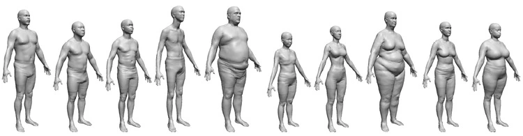 此外,很多物品在使用时必须考虑到人体的个性化和人体柔软变形(以及不同站姿所导致的人体形状变化)情况。比如在鞋服领域,人体是典型的非标对象(高矮胖瘦各不相同,如下图所示),加上人体的柔性动态变形(包括由呼吸导致的体腔涨缩),对全自动、无人智能化的3D精准尺寸动态测量提出了极高的要求(比如要求在重复测量20次以上的情况下,皮鞋对3D脚型的动态测量一致精度要求达到1-2mm以内、西服/衬衫对3D体型的动态测量一致精度要求达到0.5-1cm以内)。以西服衬衫的领围为例,需要提取人体脖颈处的围度,偏瘦型人体可通过明显特征如喉结突出点来定位几何关键点,但偏胖型人体在外形上可能无法找到喉结突出点,这就让人体参数全自动测量算法针对任意人体的多次测量一致性和稳定性提出了很高的要求。