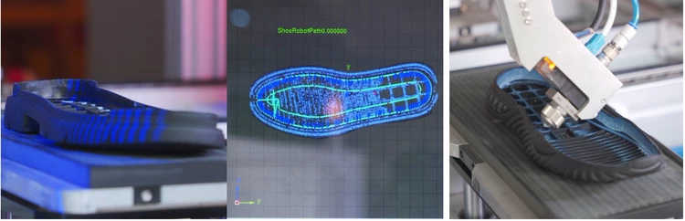 先以下图中的鞋底自动喷胶为例,首先对柔性鞋底进行3D视觉扫描,获取其当前的3D形状,然后仿真模拟该鞋底在将来的“压底”工序中会遭受的受力变形情况,并提前预估获得将来受力形变后的喷胶路径,然后机器人根据这预估好的、将要形变后的路径进行精准喷胶。