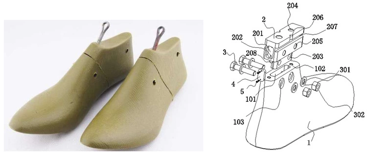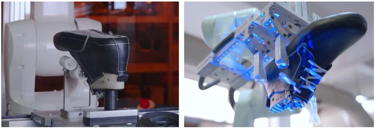 这里需要额外提一下3D视觉识别定位的附加好处是还避免了高成本的定制楦。下图左边是标准的鞋楦(成本38元/双左右),如果没有3D视觉,机器人/机械臂是无法对其自动识别定位的,只能通过在鞋楦上方额外安装一个高精度(微米级)加工的金属模组(见下图右边,一双定制楦的改造成本高达270-320元/双)来辅助机器人进行定位。因为工厂每年要生产许多种不同款型的鞋款,据国内男鞋龙头企业的预估计算,每年工厂仅定制改造楦的成本就要花费500多万元。而采用3D视觉则完全避免了这笔额外的花费,可以100%兼容识别普通的鞋楦,同时仍可精准地引导机器人自动定位鞋楦的空间位置,以便进行接下来的各种工序精准操作。