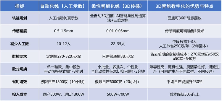 这里特别需要强调的是,对于以往的自动化线来说,切换生产不同的鞋款类型,需要工程师事先手把手地引导机械臂记忆新的路径(即示教),中间需要长达几个小时的反复修正和调整才能生成一个比较满意的路径,然后机械臂根据该路径对所有鞋子进行千篇一律、照葫芦画瓢式的刚性操作。而采用3D视觉和3D智能数字化,只需1分钟之内就可以实现整条产线的新款型切换,更可全自动地实现对每一只鞋子的柔性路径优化以获得比人工(高级技工)手眼配合更为精准的路径定位。此外在产能方面,3D智能化线可以达到从未有过的日产6000双,相比于之前的自动化线日产1800双,产能提升230%。