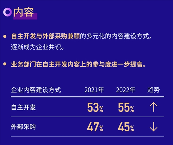 内容层面,自主开发与外部采购兼顾的多元化的内容建设方式逐渐成为企业共识,一方面企业对高品质、强交互、高转化潜力的专业内容需求旺盛;另一方面自主开发内容“修炼内功”也是企业培训人的阶段工作重心。业务部门在自主开发内容上的参与度进一步提高。企业培训从业者倾向于利用自主开发内容盘活企业既有资源,带动企业管理者与业务部门参与感,双方共创的内容将进一步提升培训效果并深化双方信任。