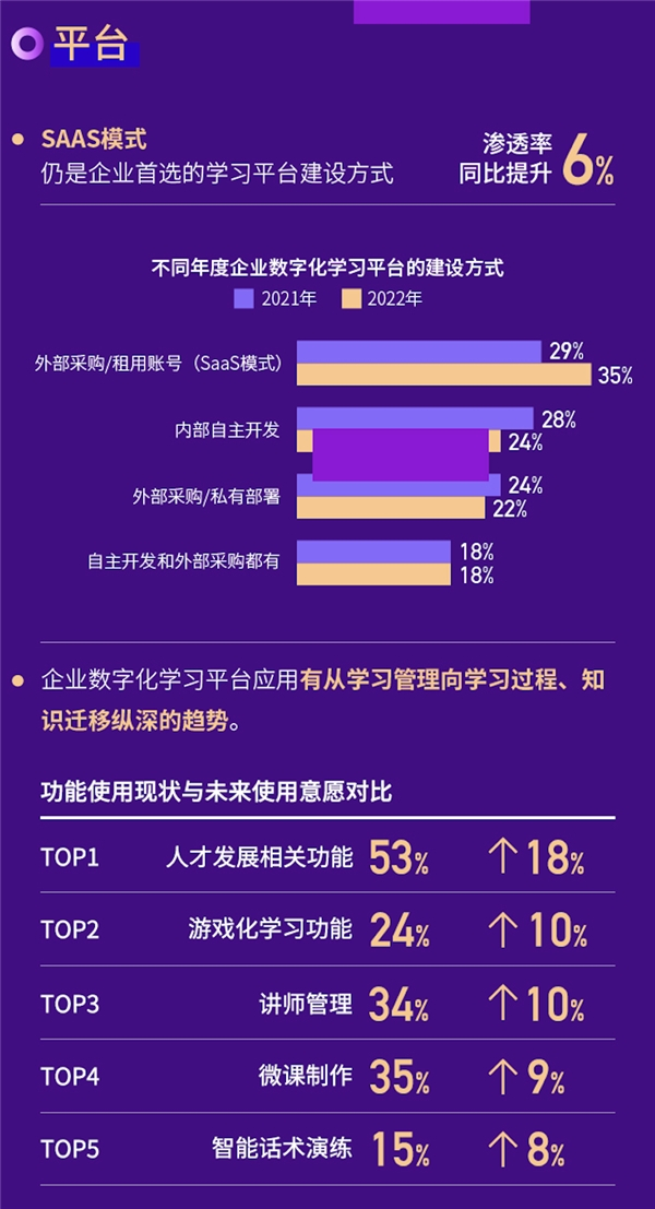 平台层面,企业数字化学习平台应用有从学习管理向学习过程、知识迁移纵深的趋势。这跟企业在当前环境下,越来越关注培训的实效有关系。此外,我们还发现数字化学习平台能够有效支撑学习项目设计、数字化的运营实施,提升项目落地效率是企业的核心关切。